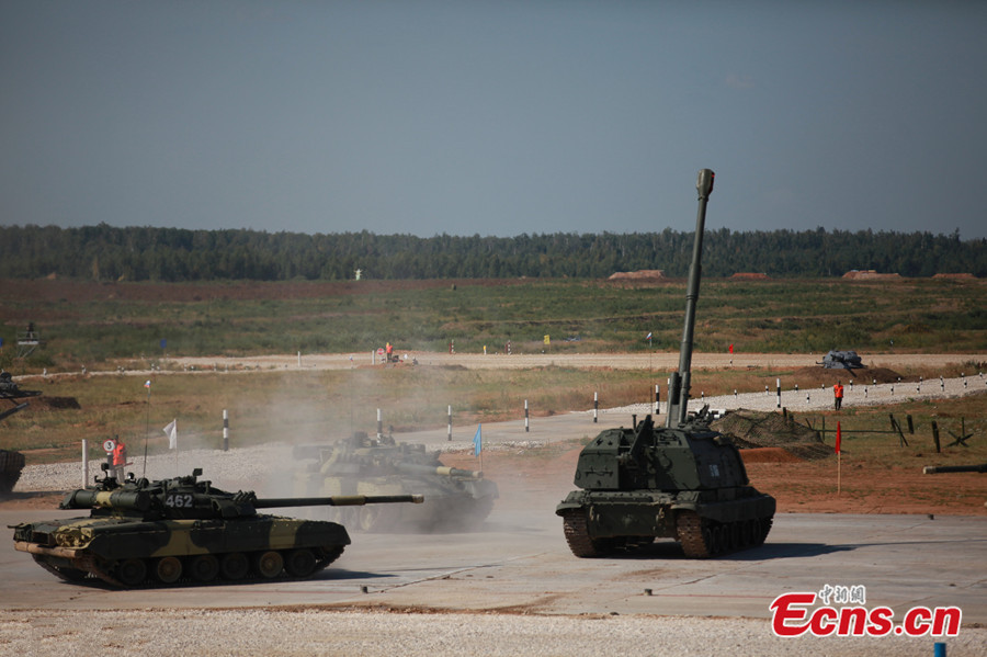 A tank biathlon championship is held in the Alabino firing range of Moscow region, Russia on August 4, 2014. (CNS/Jia Jingfeng)