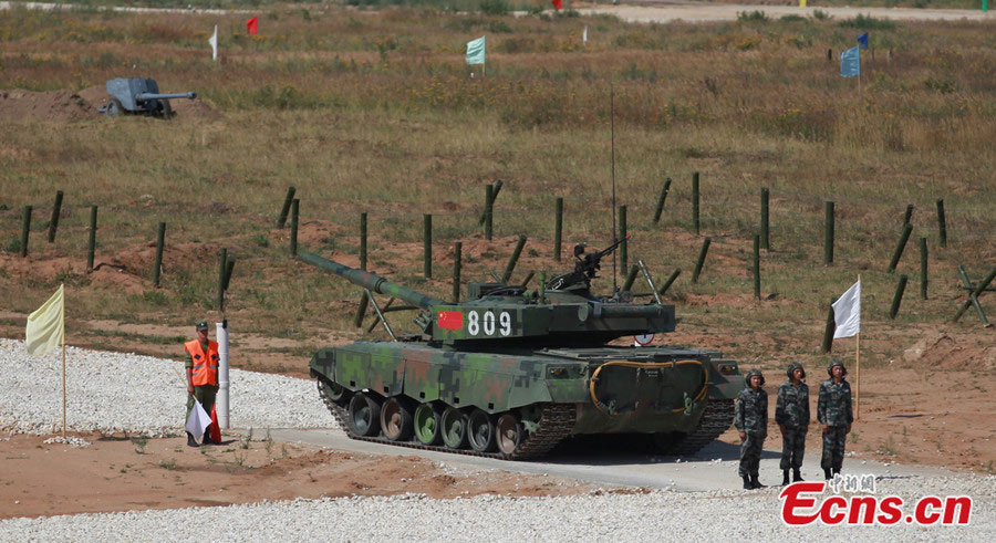 China's Type 96A main battle tank is seen at the tank biathlon championship in the Alabino firing range of Moscow region, Russia on August 4, 2014. (CNS/Jia Jingfeng)