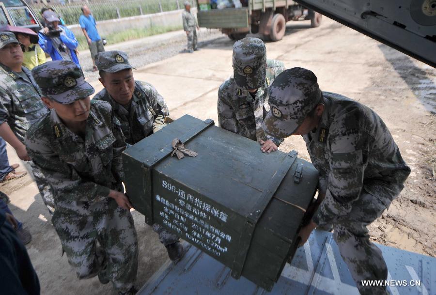Soldiers load a crate containing tent parts onto a helicopter which is bound for Longtoushan Town of Ludian County, the epicenter of a 6.5-magnitude earthquake, from an airport in Zhaotong, southwest China's Yunnan Province, Aug. 5, 2014. Military helicopters have been deployed to transfer those who were injured in the earthquake that hit Yunnan and deliver disaster relief supplies. Air delivery is expected to avoid ground barriers after the quake and offer higher rescue efficiency. (Xinhua/Xue Yubin)