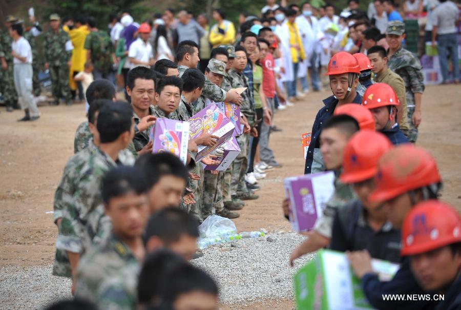 Soldiers and rescuers unload food supplies from a helicopter that landed in Longtoushan Town of Ludian County, the epicenter of a 6.5-magnitude earthquake, in southwest China's Yunnan Province, Aug. 5, 2014. Military helicopters have been deployed to transfer those who were injured in the earthquake that hit Yunnan and deliver disaster relief supplies. Air delivery is expected to avoid ground barriers after the quake and offer higher rescue efficiency. (Xinhua/Xue Yubin)