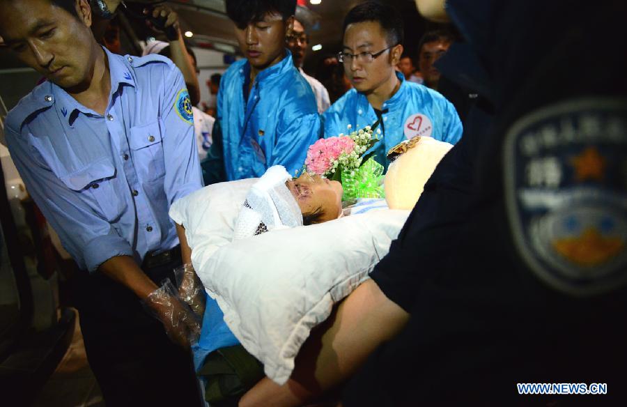 A person injured in quake-hit area is carried to get off a special train after arriving at the Kunming Railway Station in Kunming, capital of southwest China's Yunnan Province, Aug. 5, 2014. The 6.5-magnitude earthquake that struck Yunnan's Ludian County on Sunday afternoon has left at least 410 people dead. (Xinhua/Hou Wenkun)