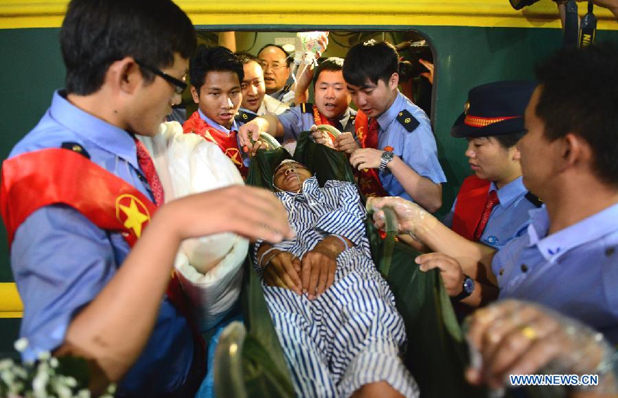 A person injured in quake-hit area is carried to get off a special train after arriving at the Kunming Railway Station in Kunming, capital of southwest China's Yunnan Province, Aug. 5, 2014. The 6.5-magnitude earthquake that struck Yunnan's Ludian County on Sunday afternoon has left at least 410 people dead. (Xinhua/Hou Wenkun)