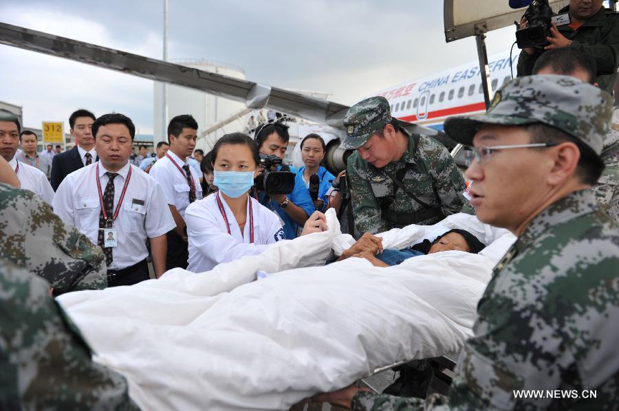 An old woman injured in earthquake is carried from the airplane after arriving in Kunming, capital of southwest China's Yunnan Province, Aug. 5, 2014. The 6.5-magnitude earthquake that struck Yunnan's Ludian County of Zhaotong City on Sunday afternoon has left at least 410 people dead. (Xinhua)