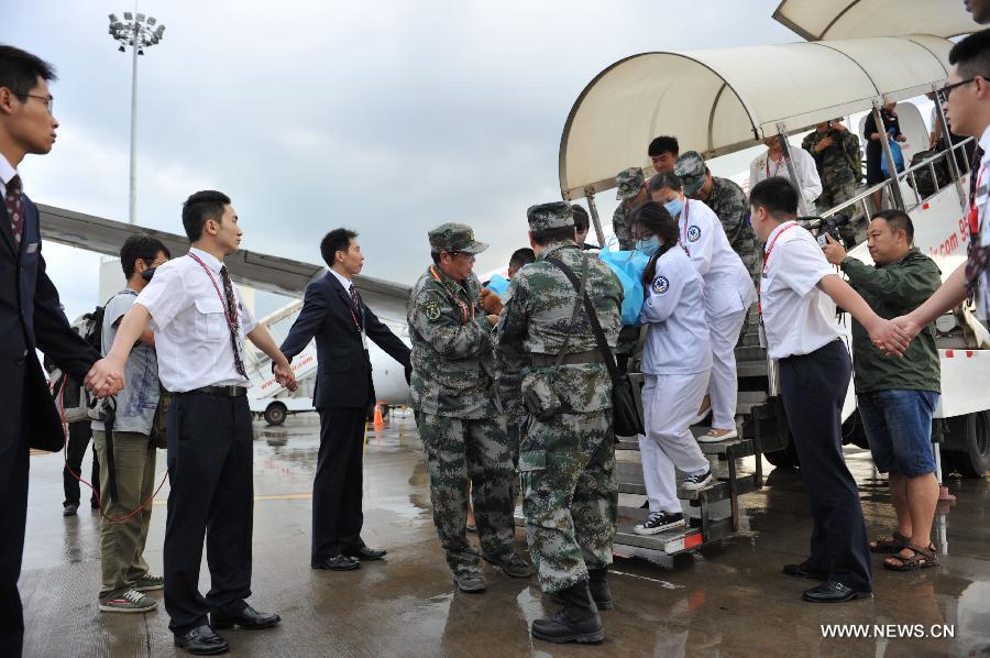 | A person injured in earthquake is carried from the airplane after arriving in Kunming, capital of southwest China's Yunnan Province, Aug. 5, 2014. The 6.5-magnitude earthquake that struck Yunnan's Ludian County of Zhaotong City on Sunday afternoon has left at least 410 people dead. (Xinhua) |