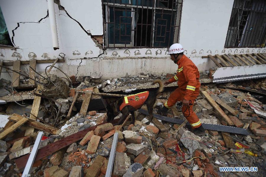 | A rescue dog guides a rescuer to search for missing people in quake-hit Longtoushan Town of Ludian County, southwest China's Yunnan Province, Aug. 5, 2014. The 6.5-magnitude earthquake that struck Yunnan's Ludian County on Sunday afternoon has left at least 410 people dead. (Xinhua) |