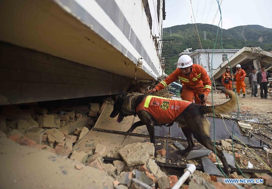 A rescue dog guides a rescuer to search for missing people in quake-hit Longtoushan Town of Ludian County, southwest China's Yunnan Province, Aug. 5, 2014. The 6.5-magnitude earthquake that struck Yunnan's Ludian County on Sunday afternoon has left at least 410 people dead. (Xinhua)