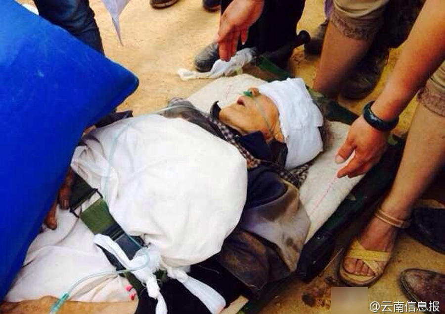 An 88 years old woman is finally saved after being buried for 50 hours in debris at 6:41 p.m. on August 5, 2014. A member of the medical team says the old woman is in good condition. (Photo/ynxxb.com)
