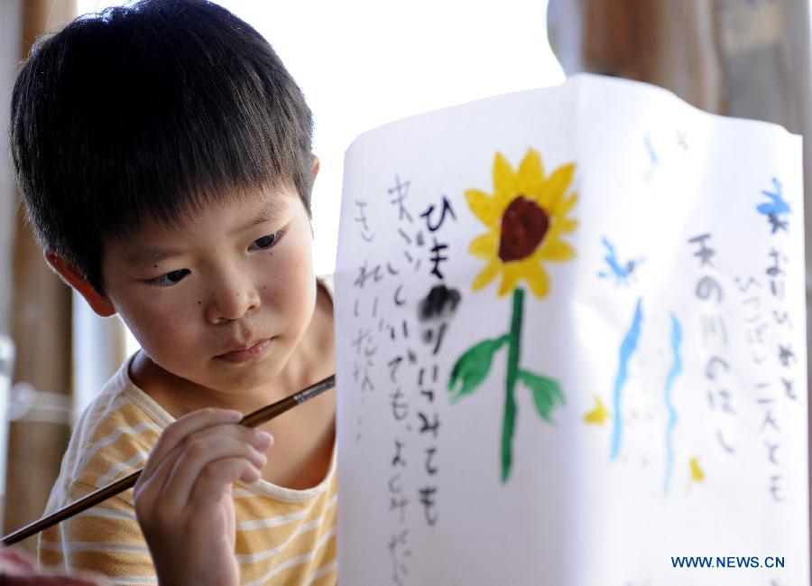 A Japanese boy paints on a lantern to mark the 69th anniversary of the US atomic bombing of Hiroshima at Maruki Gallary in Saitama, Japan, Aug. 6, 2014. (Xinhua/Stringer)