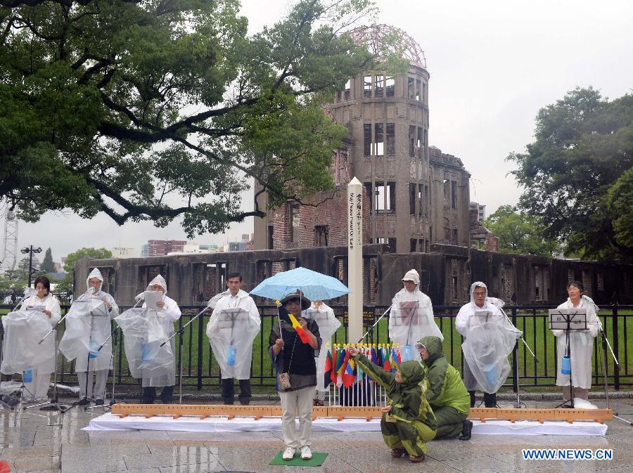 People shout slogans to call for peace at the Peace Memorial Park in Hiroshima on August 6, 2014. Hiroshima, the city that suffered U.S. atomic bombing in 1945 during the World War II, commemorated the 69th anniversary of the bombing on Wednesday at the city's Peace Memorial Park. (Xinhua/Ma Ping)
