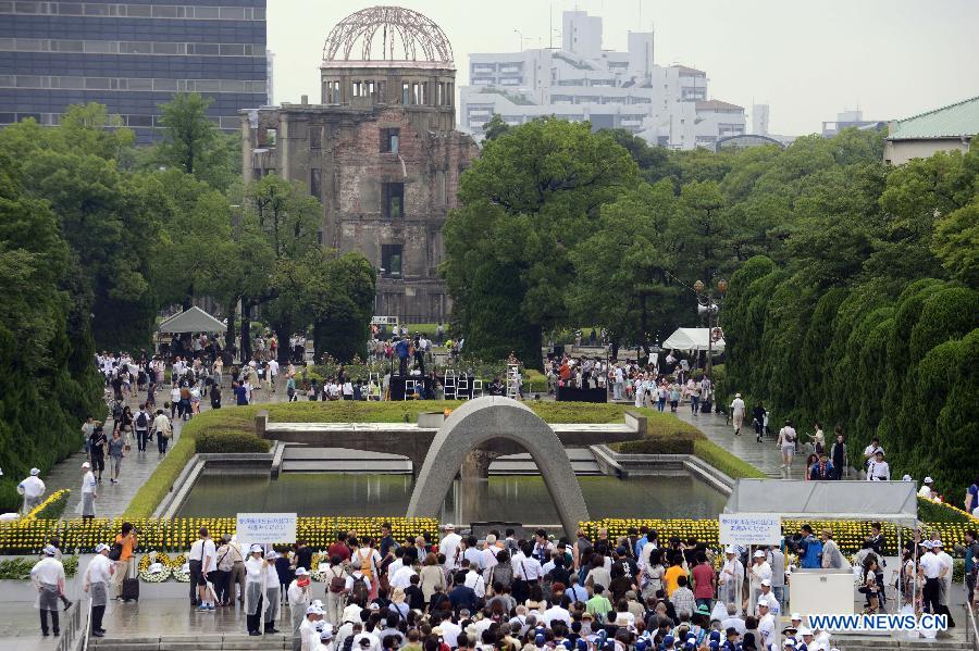 People gather in front of the Atomic Bomb Dome (background) at the Peace Memorial Park to pray for the victims of the 1945 atomic bombing in Hiroshima on August 6, 2014. Hiroshima, the city that suffered U.S. atomic bombing in 1945 during the World War II, commemorated the 69th anniversary of the bombing on Wednesday at the city's Peace Memorial Park. (Xinhua/Ma Ping)