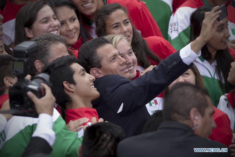 Mexican President Enrique Pena Nieto (C) attends the flag ceremony of the Mexican delegation for the 2014 Nanjing Youth Olympic Games and for the men's and women's national teams of volleyball and the men's national team of basketball for the World Championships, at Los Pinos Official Residence in Mexico City, capital of Mecico, on Aug. 6, 2014. (Xinhua/Alejandro Ayala)