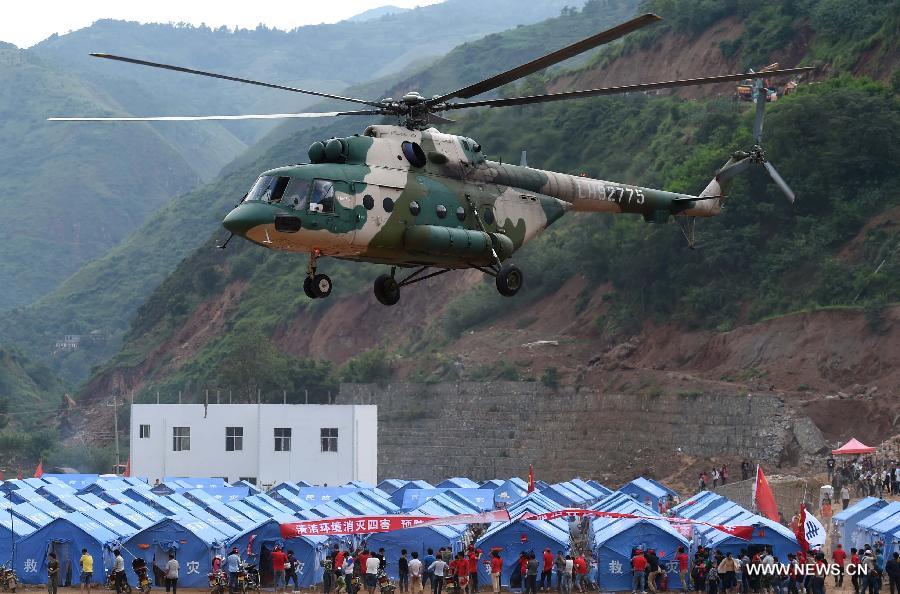 A military helicopter prepares to land in a temporary settlement set up after a 6.5-magnitude earthquake in Ludian County of Zhaotong, southwest China's Yunnan Province, Aug. 6, 2014. Disaster relief work is in progress after the earthquake struck Yunnan on Sunday afternoon. Civillians in temporary settlements within areas that are most severely affected have already had access to fresh meal and potable water. (Xinhua/Lin Yiguang)