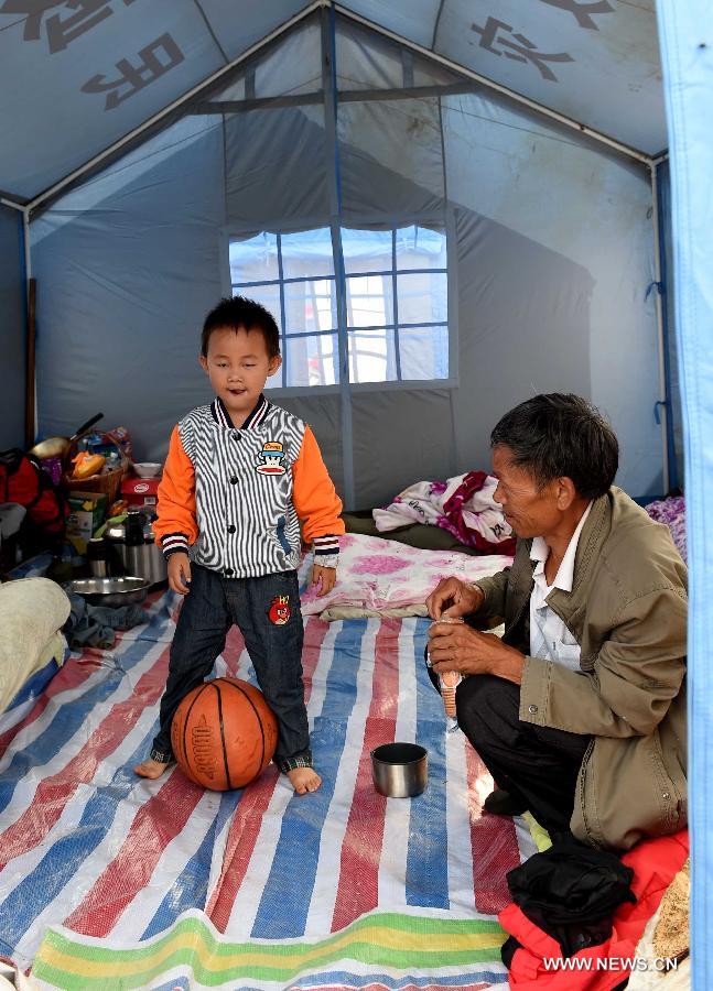 | Chen Yu (L), 5, plays basketball at a temporary resettlement in quake-hit Longtoushan Town of Ludian County, southwest China's Yunnan Province, Aug. 7, 2014. (Xinhua/Lin Yiguang) |