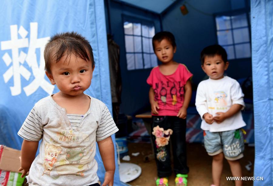 Children stay at a temporary resettlement in quake-hit Longtoushan Town of Ludian County, southwest China's Yunnan Province, Aug. 6, 2014. (Xinhua/Lin Yiguang)