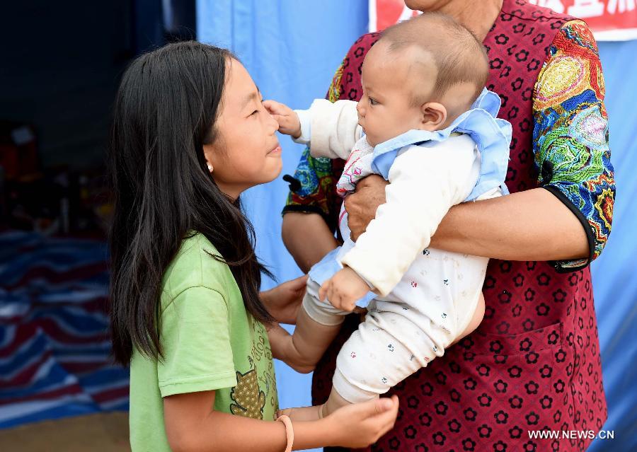 Children play at a temporary resettlement in quake-hit Longtoushan Town of Ludian County, southwest China's Yunnan Province, Aug. 6, 2014. (Xinhua/Lin Yiguang)