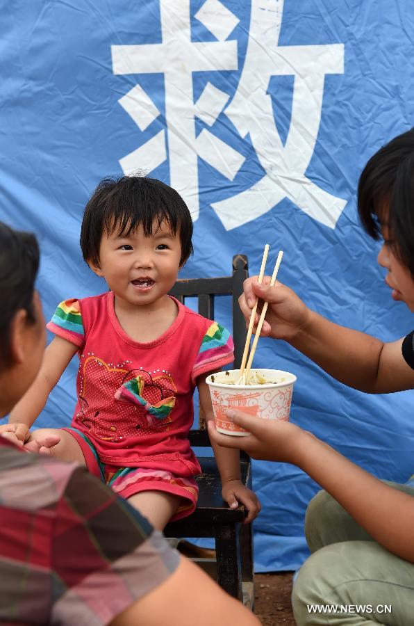 A young girl is fed at a temporary resettlement in quake-hit Longtoushan Town of Ludian County, southwest China's Yunnan Province, Aug. 6, 2014. (Xinhua/Lin Yiguang)