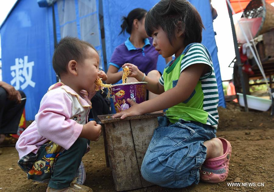 Xie Weijia (R), 5, and her sister have breakfast at a temporary resettlement in quake-hit Longtoushan Town of Ludian County, southwest China's Yunnan Province, Aug. 7, 2014. (Xinhua/Lin Yiguang)