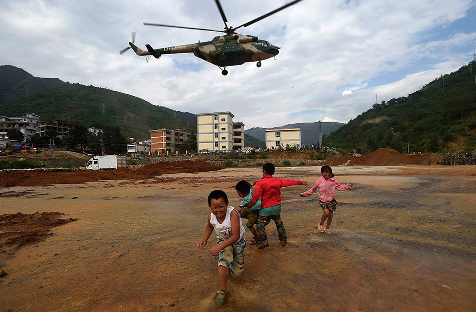 A helicopter is about to land on August 5, 2014. (Xinhua)