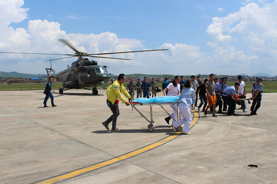 A helicopter takes the wounded to a military airport and rescuers carry them for treatment on August 5, 2014. (Xinhua/Wu Peng)