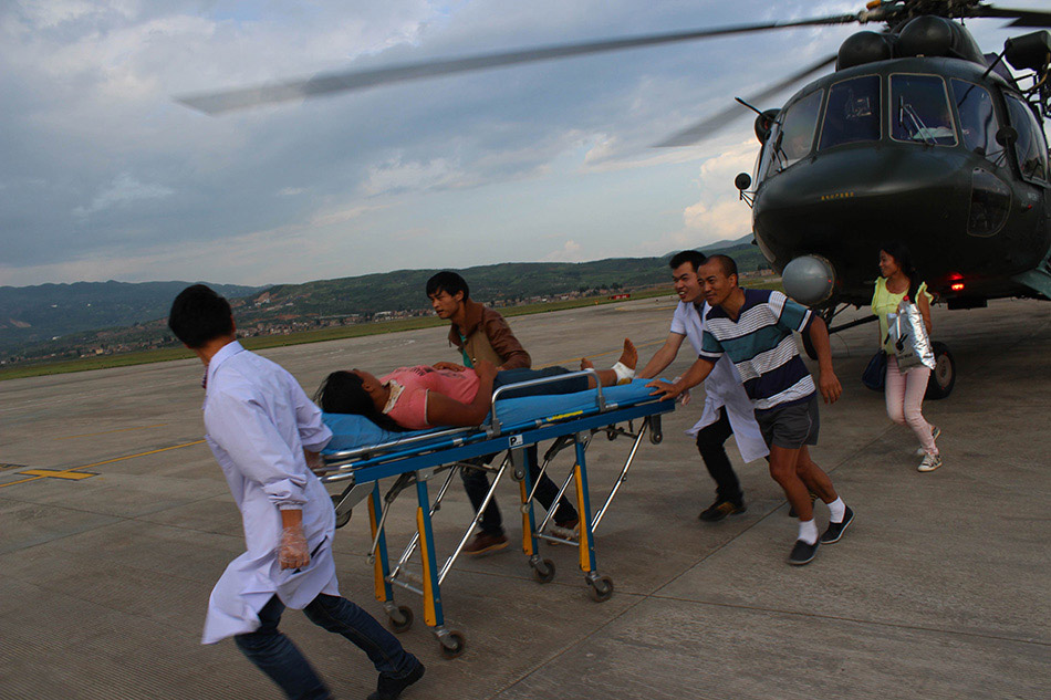 A helicopter takes the wounded to a military airport and rescuers carry them for treatment on August 5, 2014. (Xinhua/Wu Peng)