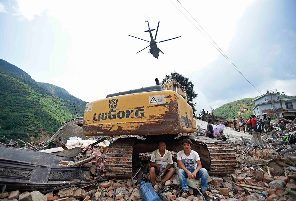 A helicopter flies over a county in Ludian, epicenter of the Yunnan earthquake on August 5, 2014. (Xinhua)