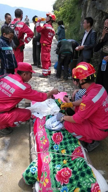 Thirteen members of the China International Search & Rescue Team rescue a severely wounded woman around 20 kilometers away from the epicenter of the Yunnan earthquake. (JZ.81.CN)