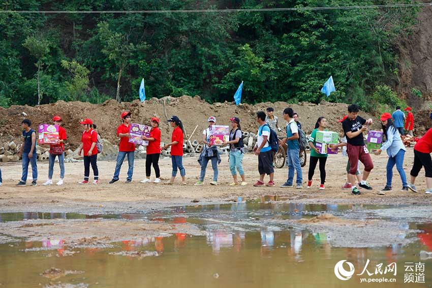 Volunteers and victims carry disaster relief goods. (People's Daily Online/Li Faxing)