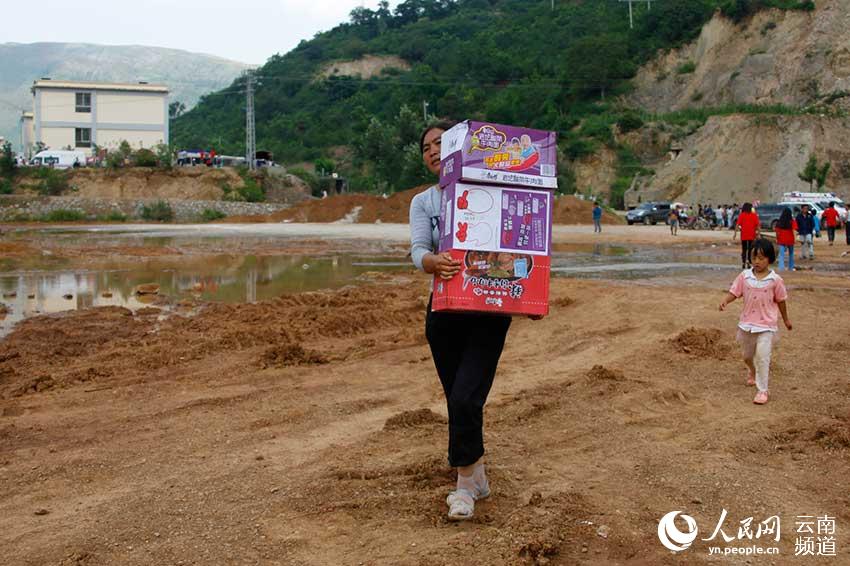 A victim carries disaster relief goods. (People's Daily Online/Li Faxing)