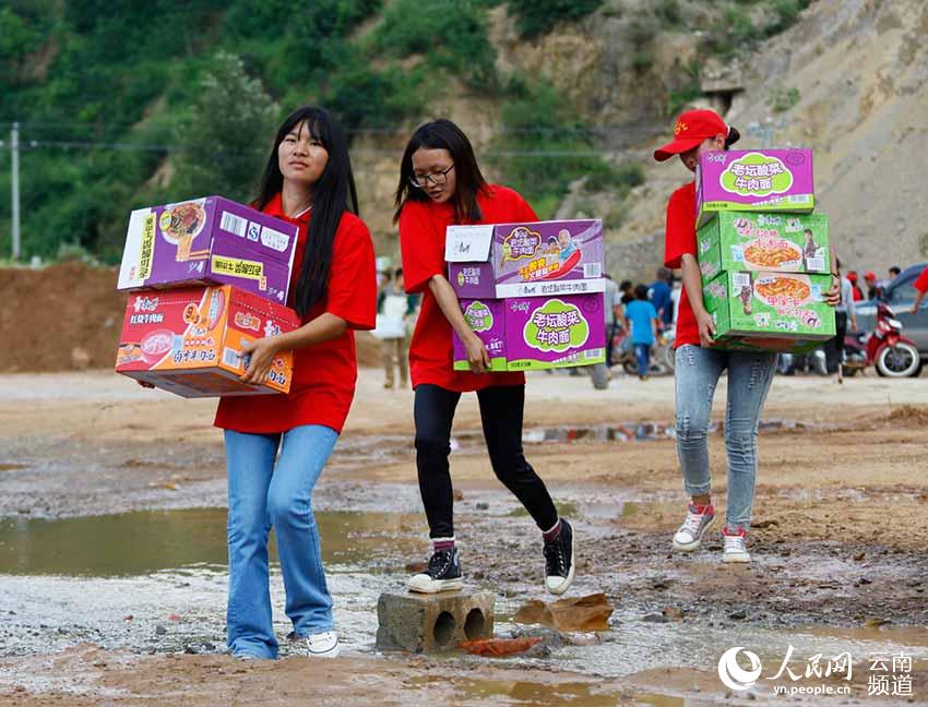Several volunteers carry disaster relief goods. (People's Daily Online/Li Faxing)