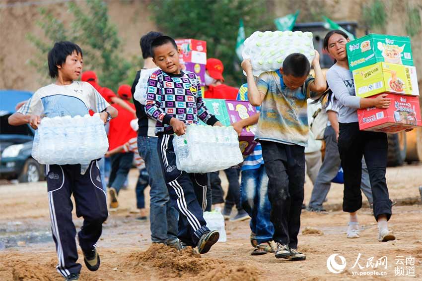Several children carry disaster relief goods. (People's Daily Online/Li Faxing)