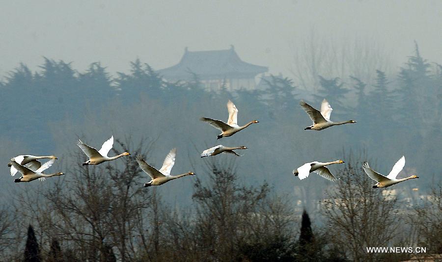 A group of white swans fly in Yellow River Wetland in Sanmenxia, central China's Henan Province, Jan. 4, 2013. Yellow River Wetland is a National Natural Reserve with a total area of 68 thousands hectare in Henan Province. It's a bird breeding place with over 41 types of animals under first-grade and second-grade protection at the state level. (Xinhua/Wang Song)