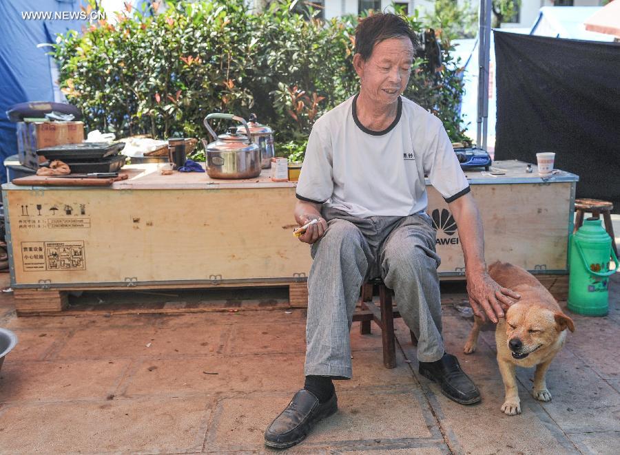 Shen Youqing, whose wife died in a 6.5-magnitude earthquake, is accompanied by his dog Xiaohuang outside a makeshift tent in a temporary settlement in Ludian County, Zhaotong, southwest China's Yunnan Province, Aug. 7, 2014. (Xinhua/Liu Xu)