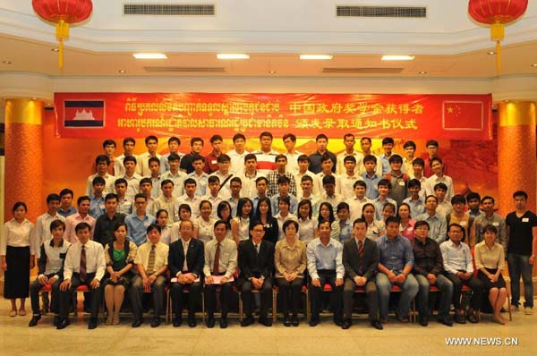 | Cambodian scholarship awardees pose for photos with Chinese embassy officials and Cambodian education officials in Phnom Penh, Cambodia, Aug. 8, 2014. The Chinese government has granted annual scholarships to 72 Cambodian students to pursue their bachelor's, master's, and doctorate's degrees in various universities in China. (Xinhua/Li Hong) |