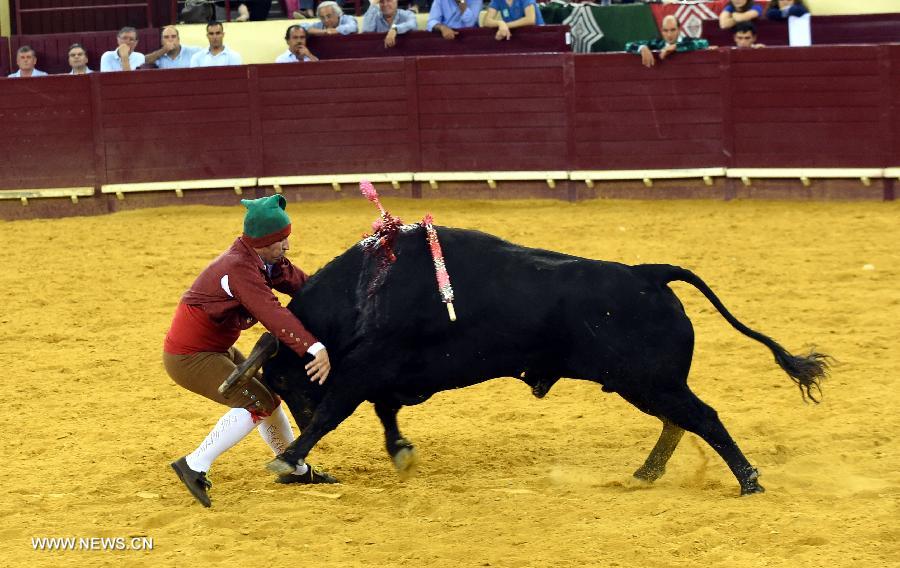 A man performs during a traditional Portuguese bullfight at Lisbon's Campo Pequeno bullring, Portugal, Aug. 7, 2014. Portuguese bullfighting is different and far less gory than the Spanish version where the bull is stabbed to death if the matador manages to win the contest. (Xinhua/Zhang Liyun)