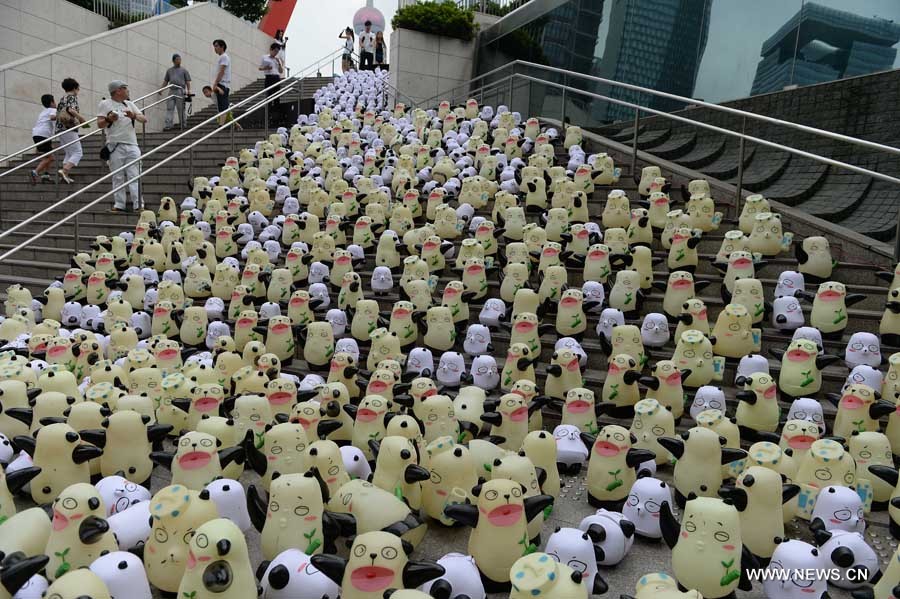 Tourists pose for photo with "Pan Da" in Shanghai World Financial Center in Shanghai, east China, Aug. 8, 2014. 1000 "Pan Da", which were made by different crafts, appear in Shanghai World Financial Center on Friday. (Xinhua/Lai Xinlin)