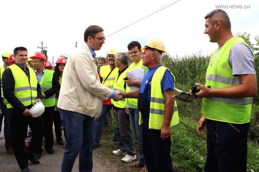 Serbian Prime Minister Aleksandar Vucic (front L) shakes hands with a worker as he attends the opening ceremony of the construction works at the European Corridor E763 through Serbia near the town of Ub, Serbia on Aug. 8, 2014. Chinese company Shandong High-speed started works at the European Corridor E763 through Serbia near the town of Ub on Friday, with the presence of Chinese ambassador Li Manchang. (Xinhua/Nemanja Cabric)