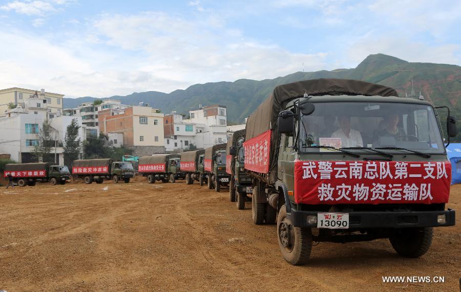 A disaster relief material transportation team arrives at Ludian County, southwest China's Yunnan Province, Aug. 10, 2014. Disaster relief work is in progress after the earthquake struck Yunnan. Civilians in temporary settlements within areas that are most severely affected have already had access to fresh meal and potable water. (Xinhua/Pei Xin)