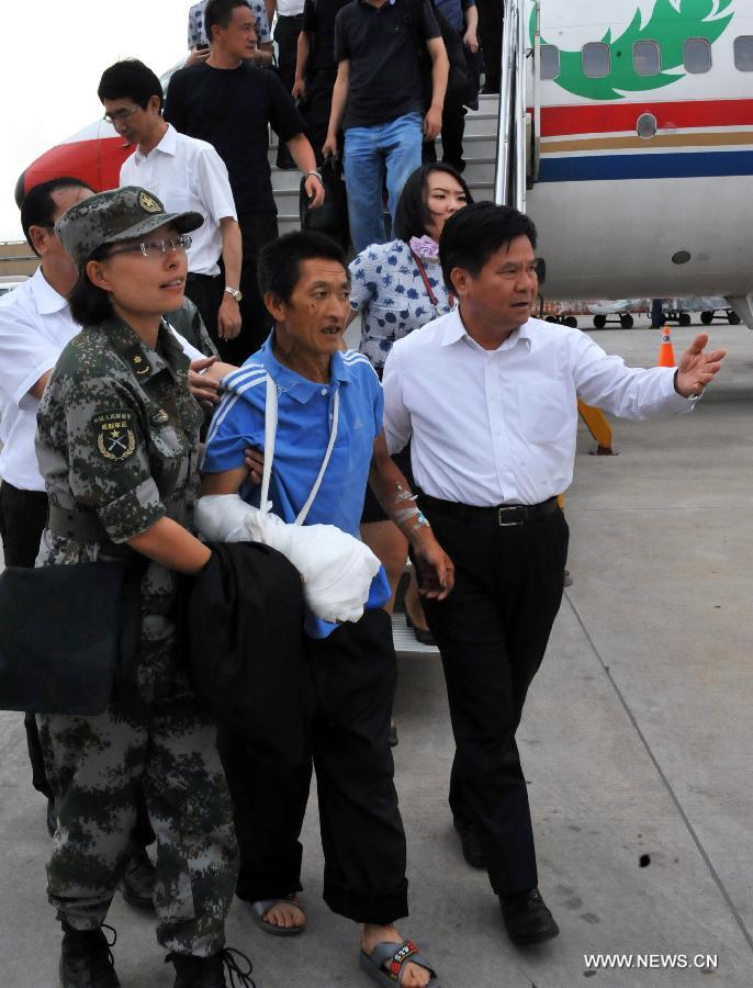 An injured person, accompanied by rescuers, flies to Kunming after an earthquake in Ludian County of Zhaotong, southwest China's Yunnan Province, Aug. 10, 2014. A 6.5-magnitude quake that struck Yunnan's Ludian County on Aug. 3 has left 617 people dead and 112 missing.(Xinhua/Chen Haining)