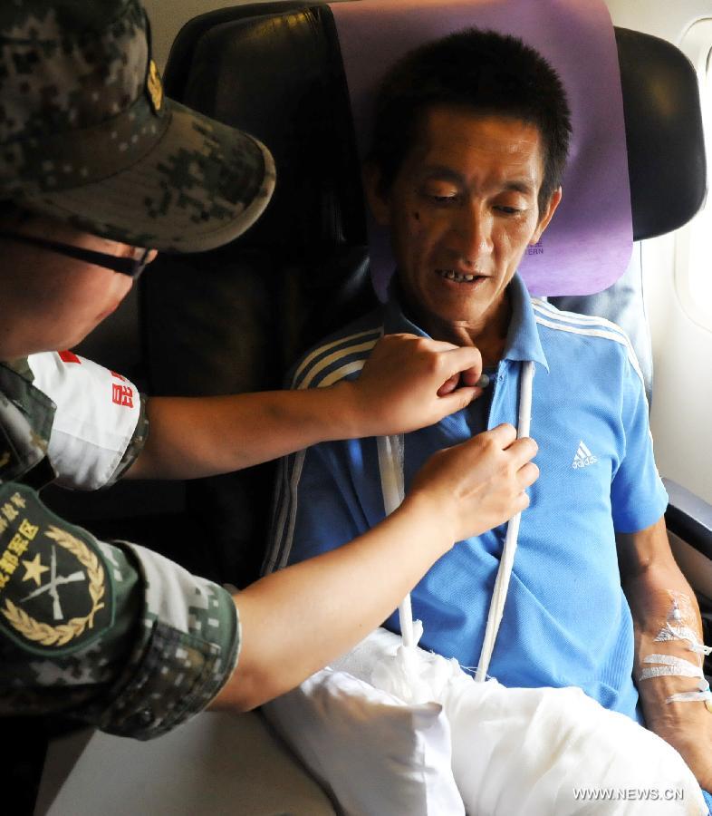 An injured person, accompanied by a medical worker, flies to Kunming after an earthquake in Ludian County of Zhaotong, southwest China's Yunnan Province, Aug. 10, 2014. A 6.5-magnitude quake that struck Yunnan's Ludian County on Aug. 3 has left 617 people dead and 112 missing.(Xinhua/Chen Haining)