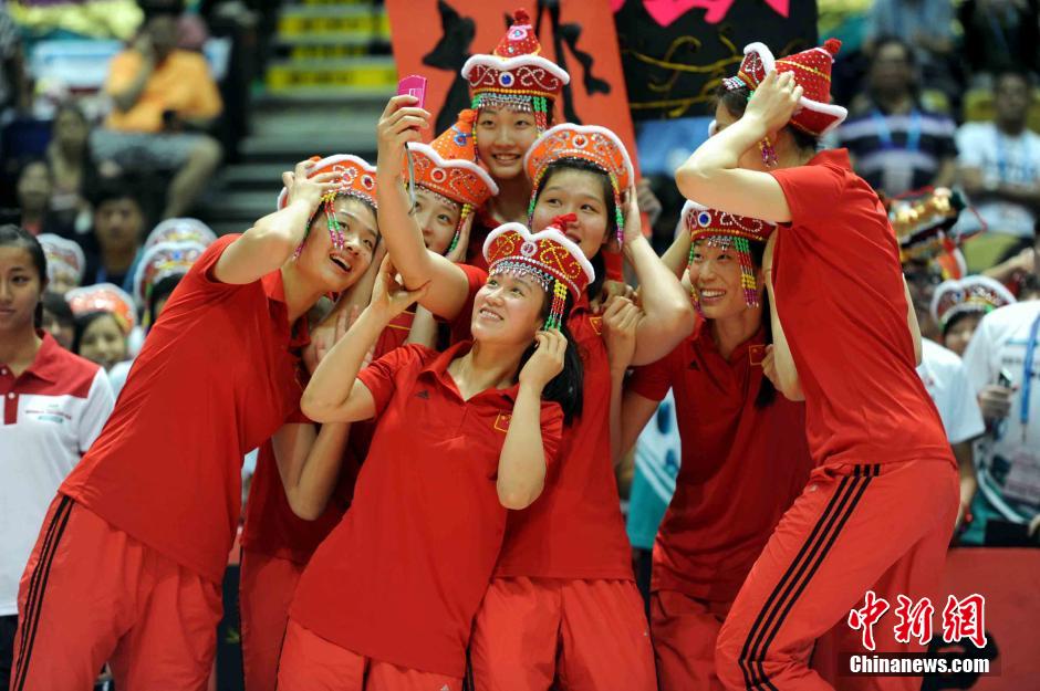 Chinese women volleyball team take selfies on the podium, after they won the gold medal at Hong Kong 2014 FIVB World Grand Prix on August. 10, 2014. (CNS/Tan Daming)