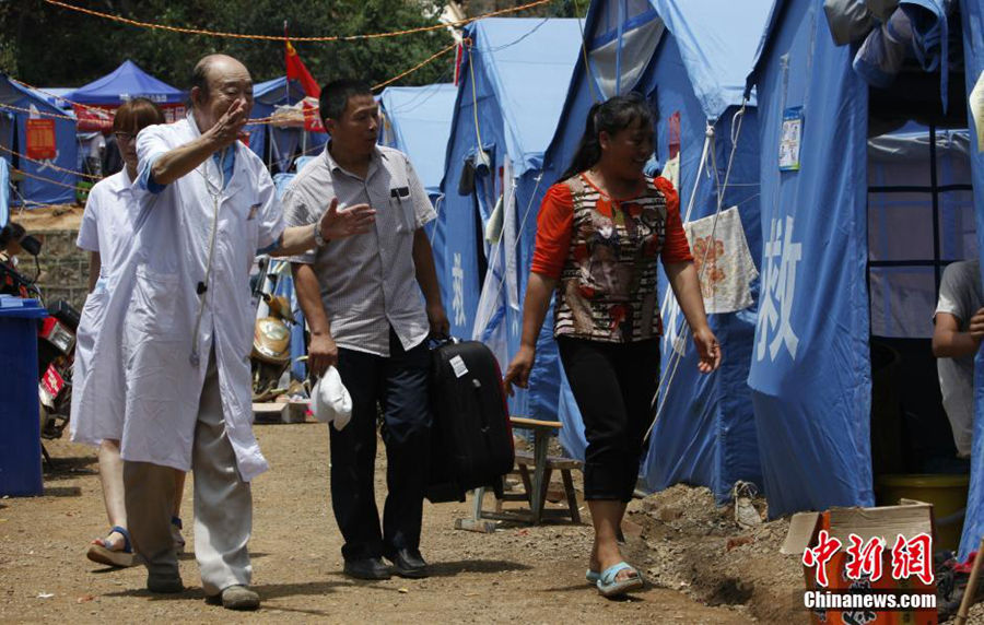 Wu Dianhua, an 80-year-old president of Jizhou Workers’ Hospital in Hebei Province, has led a medical team to help treating people in the Ludian earthquake stricken area, Aug. 10, 2014.
