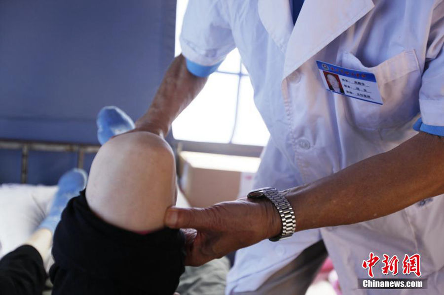 Wu Dianhua, an 80-year-old president of Jizhou Workers’ Hospital in Hebei Province, has led a medical team to help treating people in the Ludian earthquake stricken area, Aug. 10, 2014.