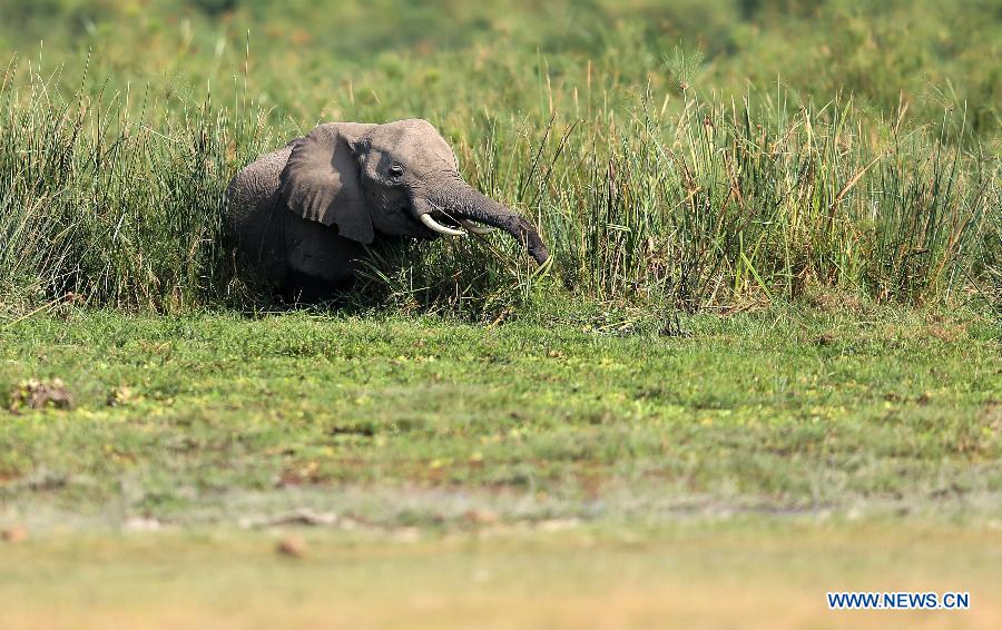 File photo shows an African elephant enjoys its meal at the Amboseli National Park of Kenya, July 16, 2014. The World Elephant Day was launched on Aug. 12, 2012 to bring attention to the urgent plight of Asian and African elephants. The escalation of poaching, habitat loss and human-elephant conflict are some of the threats to both African and Asian elephants. (Xinhua/Meng Chenguang)