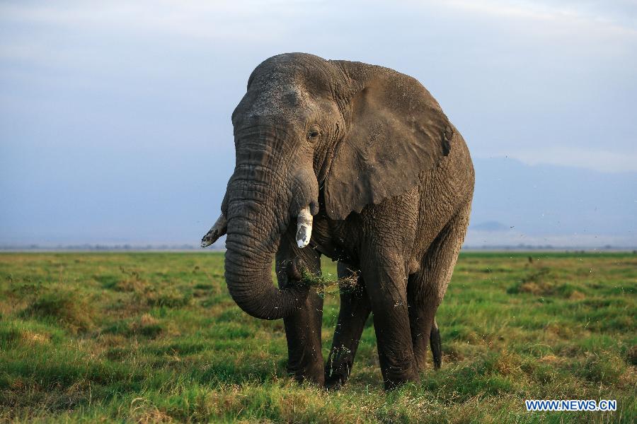 | File photo shows an African elephant enjoys its meal at the Amboseli National Park of Kenya, July 16, 2014. The World Elephant Day was launched on Aug. 12, 2012 to bring attention to the urgent plight of Asian and African elephants. The escalation of poaching, habitat loss and human-elephant conflict are some of the threats to both African and Asian elephants. (Xinhua/Meng Chenguang) |