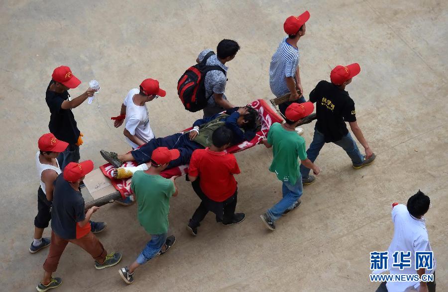 The rescue workers transport the wounded in the quake worst-hit area of Longtoushan Town of Ludian County, southwest China's Yunnan Province.((Xinhua/Tao Liang)