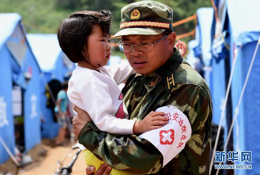 Zhang Aiguo, a national secondary psychological consultant, holds a four-year-old girl in his arm and provides psychological aid for her in a temporary settlement in Longtoushan Town. (Xinhua/Tao Liang)