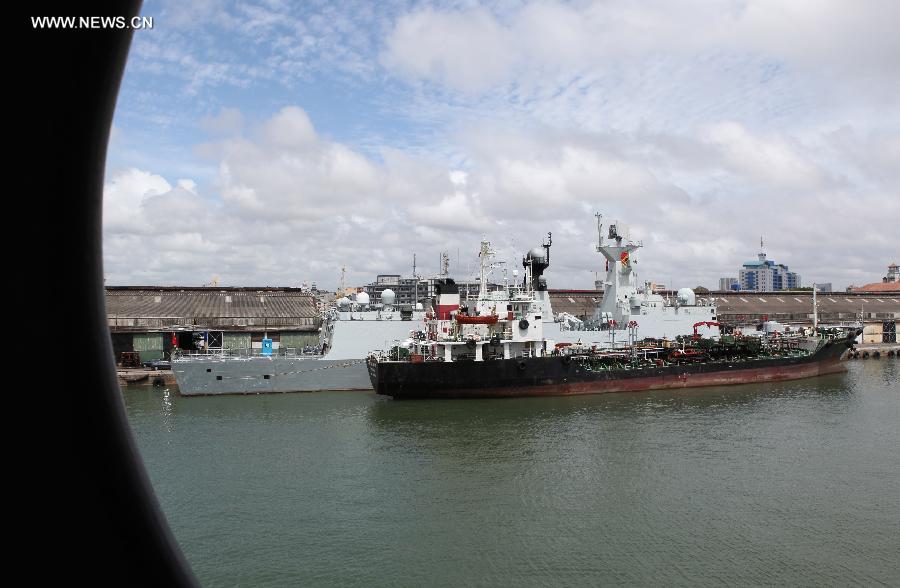Frigate Yuncheng refuels at the Colombo Harbor in Comlombo, Sri Lanka, Aug. 12, 2014. China's amphibious landing ship Changbaishan and frigate Yuncheng of the 18th escort fleet of Chinese Navy arrived in Colombo of Sri Lanka on Tuesday. The two ships will stay here for one day before they resume their voyage to fulfill their mission in the Somali waters. (Xinhua/Zhang Yuelin)
