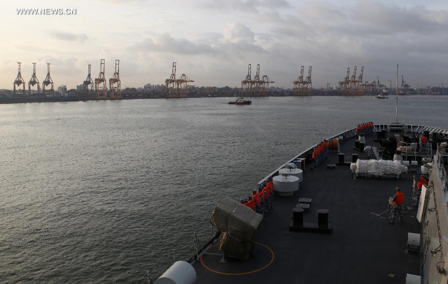 China's amphibious landing ship, the Changbaishan, sails into the Colombo Harbor in Comlombo, Sri Lanka, Aug. 12, 2014. China's amphibious landing ship Changbaishan and frigate Yuncheng of the 18th escort fleet of Chinese Navy arrived in Colombo of Sri Lanka on Tuesday. The two ships will stay here for one day before they resume their voyage to fulfill their mission in the Somali waters. (Xinhua/Zhang Yuelin)