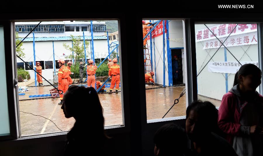 Children visit the newly-built Hope Primary School in Longtoushan Township in earthquake-hit Ludian County, southwest China's Yunnan Province, Aug. 12, 2014. The Hope Primary School, sponsored by China Youth Development Foundation and Yunnan Youth Development Foundation, is the first one built after the 6.5-magnitude earthquake. The school, which is able to accommodate more than 500 students, has 20 prefabricated rooms with each covering 56.8 square meters. A 6.5-magnitude earthquake hit Ludian of southwest China's Yunnan Province on Aug. 3, which claimed at least 617 lives and injured thousands of others. (Xinhua/Lin Yiguang)