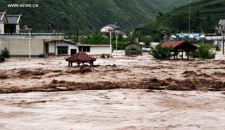 Photo taken on Aug. 12, 2014 shows the flooded Chuandong Village of Weining County, southwest China's Guizhou Province. The death toll from continuous rains in southwest China's Guizhou Province has increased to 12, with 12 still missing, local authorities said Tuesday. (Xinhua/Yue Gang)